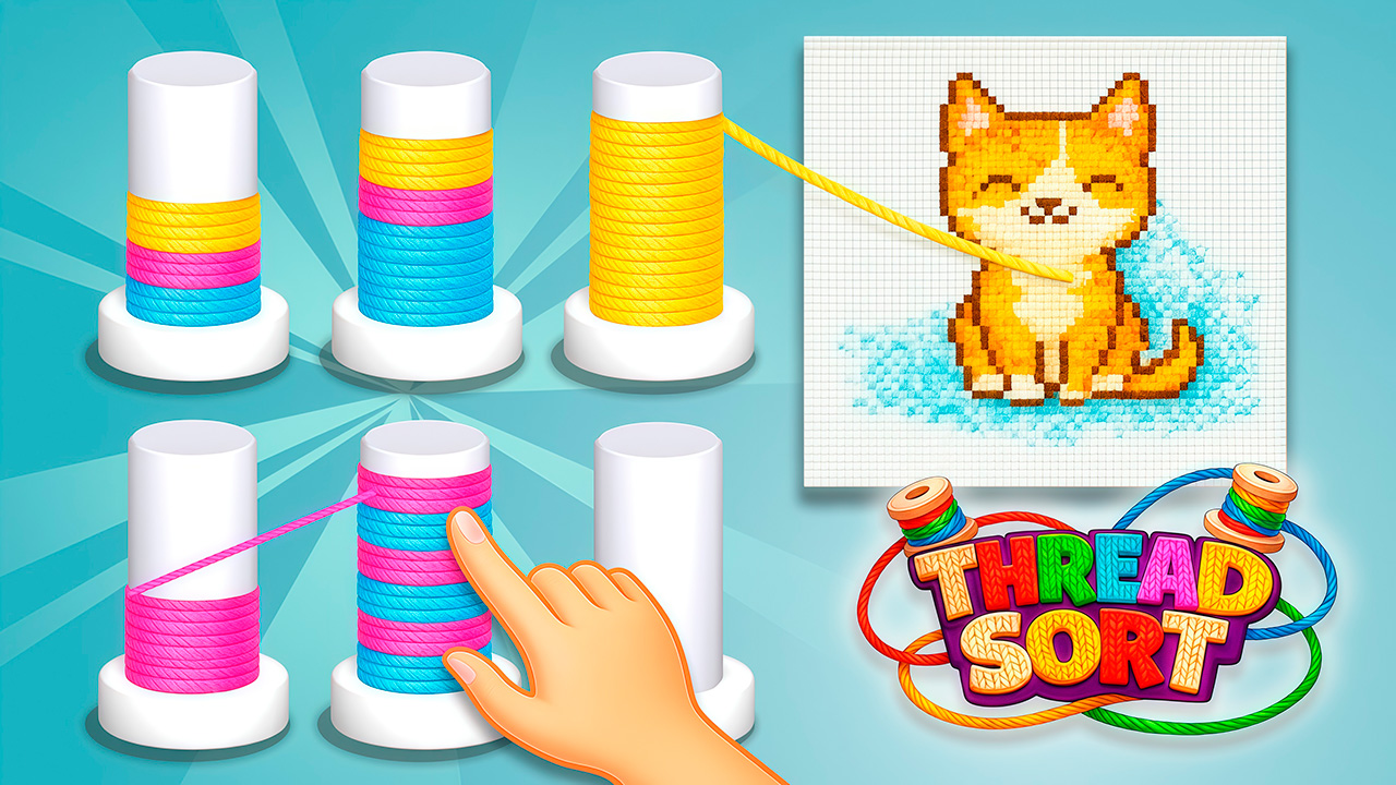 Thread Sort is a relaxing and satisfying puzzle game where you organize colorful threads on spools and turn them into beautiful cross-stitched pictures. Sort mixed threads by color, clear the pegs, and watch as neatly arranged strands automatically stitch a charming image on the canvas. With cozy visuals, smooth animations, and simple controls, Thread Sort is perfect for fans of sorting puzzles, knitting games, and calming casual challenges.